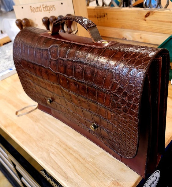 This pattern is to make the Livestock Commissioners Bag. This accordion gusset bag can hold up to a 16" wide laptop and is great for business or travel. It can be made from almost any leather between 5–6oz and sewn on most machines or even by hand. Some skiving is recommended, but not required.